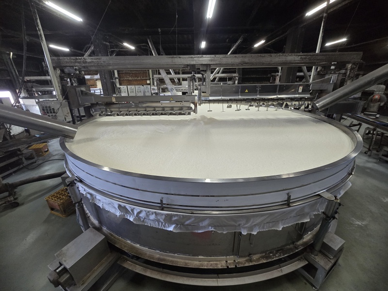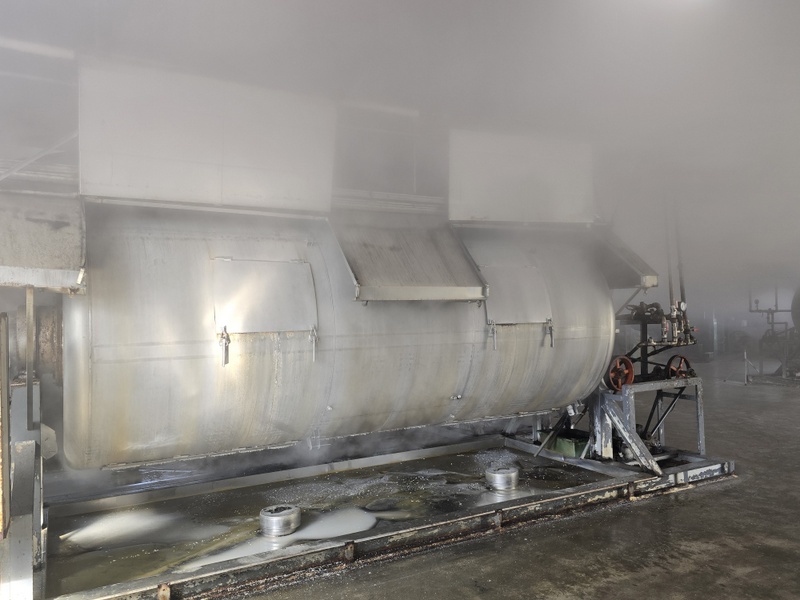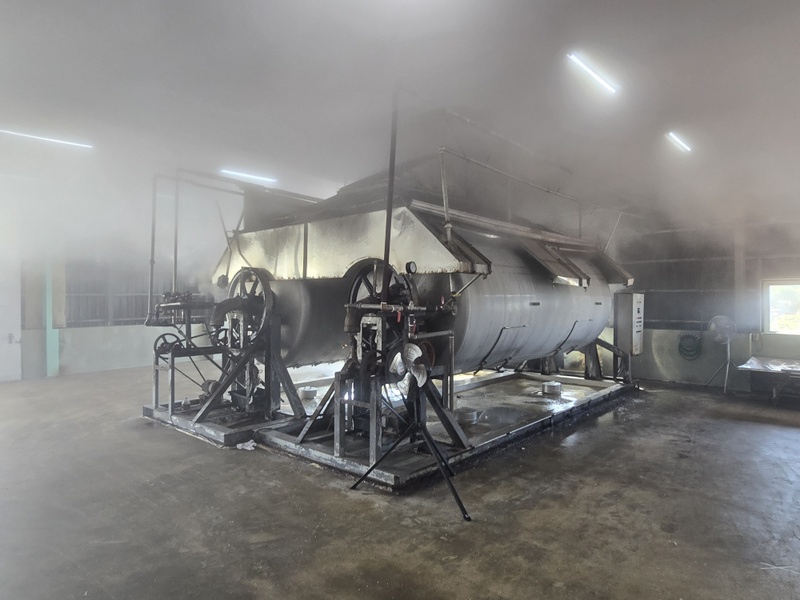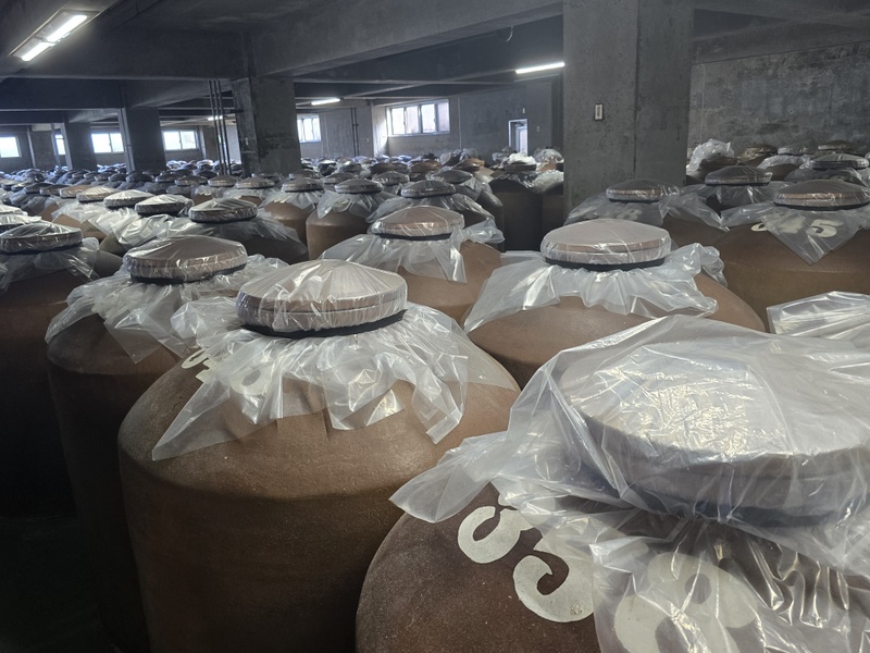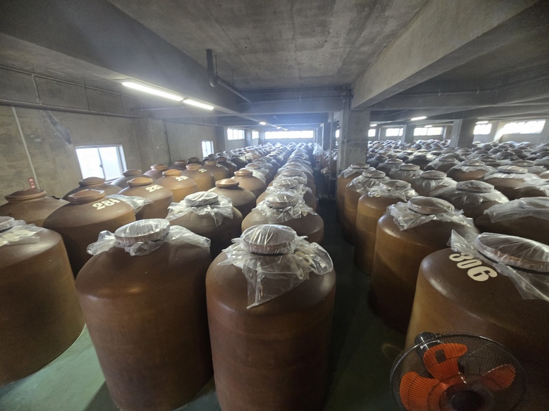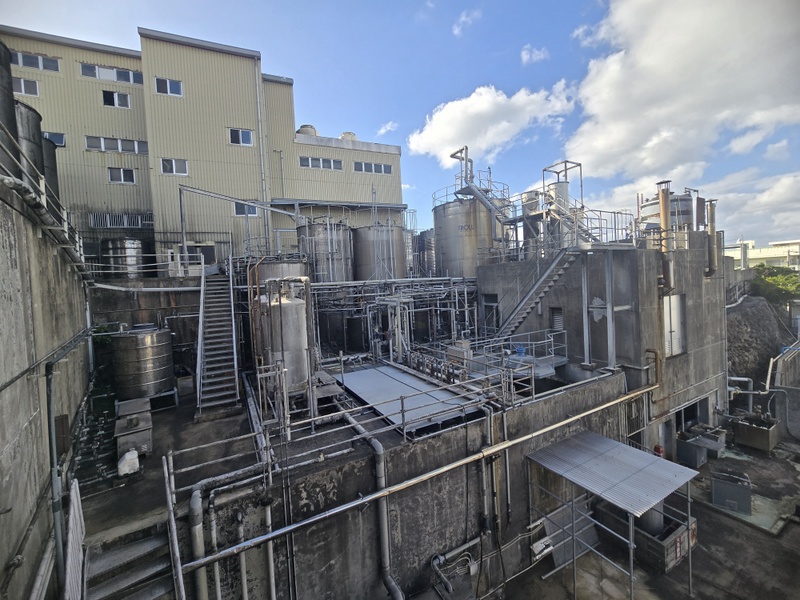 Hala z parnikami ryżu jest tak zaparowana, że mimo wiatraków i otwartych ścian prawie nic nie widać. Hala fermentacyjna jest czarna od koji, które porosło sufity, ściany, rury i powierzchnie stalowych fermentatorów. Bardzo gęsty ferment jest ręcznie mieszany drewnianą szuflą. Mimo ogromnej skali produkcji wszystko jest tu ręcznie nadzorowane. Przerabiają sprowadzany z Tajlandii ryż indica, stosują jako enzymów dwóch rodzajów czarnego koji, fermentują niemal wyłącznie z użyciem komercyjnych drożdży ‘awamori-101’. Wyjątkiem są specjalne edycje, jak np. awamori z drożdżami hodowanymi specjalnie dla nich na małych bananach z Wyspy Shima. Butelkują rocznikowane kusu, niektóre edycje mają ponad 25 lat. Podstawowe linie awamori to blendy, jak wszyscy producenci awamori stosują metodę shitsugi, japońską solerę. Nowością w ofercie jest mieszanka awamori i destylatu z gorzkiej okinawskiej limonki shikuwasa, trunek bardzo aromatyczny, rześki i cytrusowy. Długo leżakowane kusu są w ustach kremowe, niemal serowe, a jednocześnie bardzo delikatne i eleganckie w aromacie. Robią też jako jedni z nielicznych na Okinawie słodkie, niemal miodowe w smaku, shōchū z batatów – imuge.